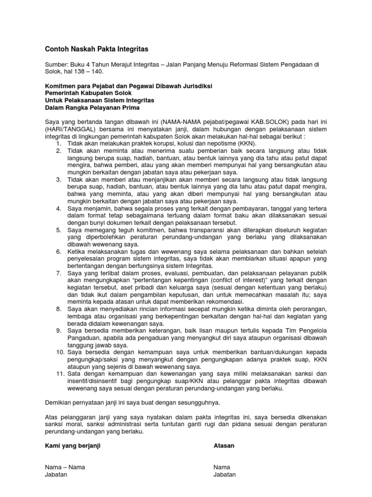Pakta Integritas Contoh / CODE SMUTs: KPK TERAPKAN SISTEM INTEGRASI NASIONAL : Berperan secara pro aktif dalam upaya.. Download file format.docx microsoft word. Apalagi bagi anda yang bekerja di sektor pemerintahan. Berikut salah satu contoh pakta integritas dalam bahasa indonesia: Sebelum kita masuk contoh pakta integritas, alangkah baiknya kita mengetahui apa itu pakta adapun tujuan dilaksanakan penandataganan pakta integritas untuk memperkuat komitmen. Jika ingin mengunduh format pdf, silakan cari di halaman.